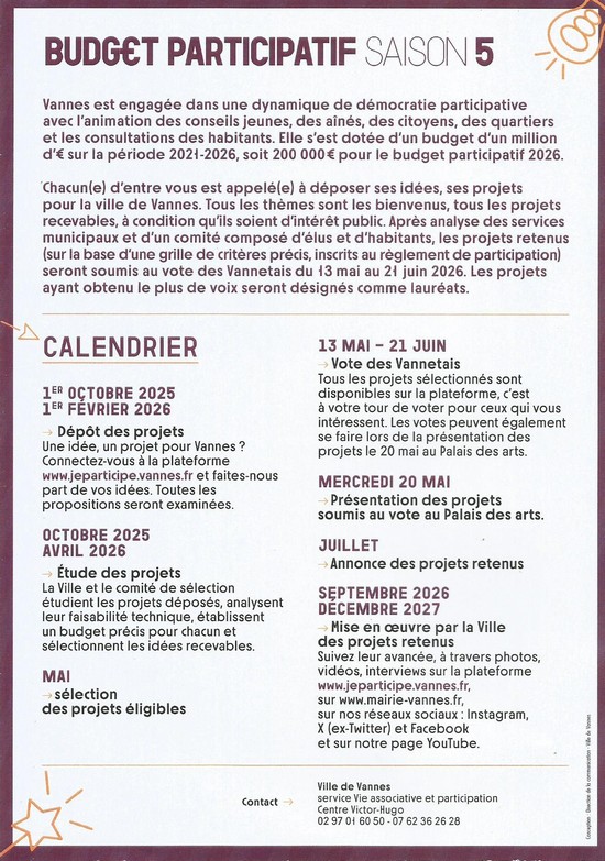 Tous les thèmes sont les bienvenus, tous les projets recevables, à condition qu’ils soient d’intérêt public. Après analyse des services municipaux et d’un comité composé d’élus et d’habitants, les projets retenus (sur la base d’une grille de critères précis, inscrits au règlement de participation) seront soumis au vote des Vannetais du 13 mai au 21 juin 2026.